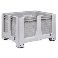 Lichte palletkist met groot volume om de lading te maximaliseren en optimaliseren. Hoge prestaties met verstevigde basis voor een gewicht van 450 kg per stuk met minimale afwijking. Bodem is voorzien van antislipnoppen voor extra veilig laden en lossen. Stevig met geoptimaliseerd ontwerp van de hoekstaanders om lasten in evenwicht te houden tijdens het verplaatsen. Snel wassen en drogen met het horizontaal aflopende oppervlak zodat water kan weglopen. Aparte zones in holte voor zelfklevende etiketten, RFID of om het merklogo in te graveren. Hogere hoekkist aan de binnenkant om het evenwicht te behouden voor veiliger stapelen. Max. belasting (kg) : 500 Max. dynamisch draagvermogen (kg) : 1000 Max. statisch draagvermogen (kg) : 4500