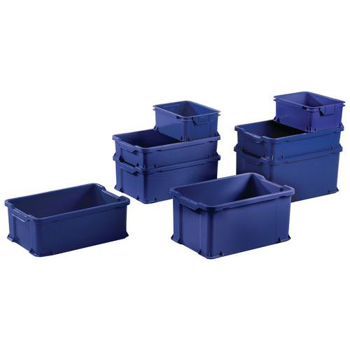 Dikke bodem en wanden: verhoogde stevigheid. Stapelbare bak met onberispelijke hygiëne voor een zekere opslag van uw producten. Veiligheid tijdens het transport door de versterkte handgrepen. Maximale stabiliteit op transportbanden door de platte bodem.
