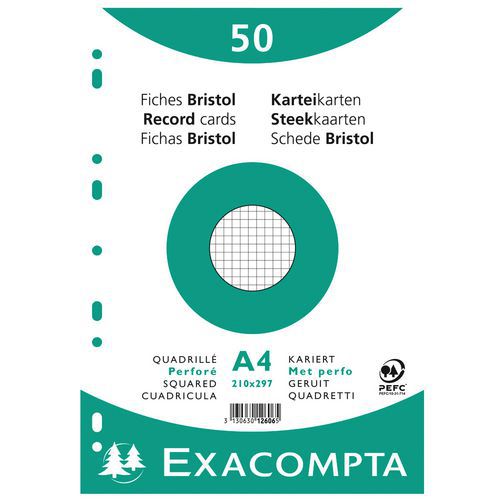 | Productnaam | Steekkaart bristol ruit 5x5 geperforeerd 210x297mm Exacompta, Gramsgewicht: 205 g/m², Aantal vellen/riem: 50 |