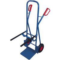 Stoelensteekwagen staal Buitenmaten: 570 x 795 x 1.305 mm (B/D/H) Steekplaat afmetingen: 320 x 250 mm (B/D) Uitvoering: Stabiele lasconstructie 2 kunststof veiligheidsgrepen Met 2 beschermplaten Draagarm van 1 ronde buis met anti-slip laag, beide buizen met een dwarsbuis met elkaar verbonden, tevens met 2 gebogen steunen bij het ophangpunt, lengte 505 mm, traploos in hoogte verstelbaar Draagvermogen: 250 kg