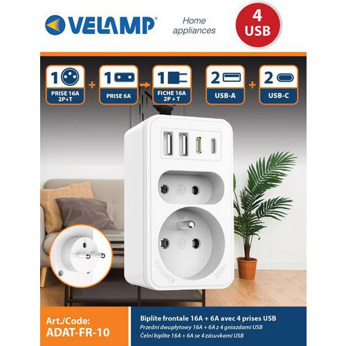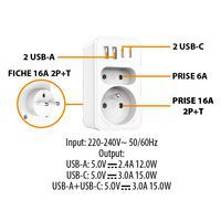 2 USB-A aansluitingen + 2 USB-C aansluitingen: voor het aansluiten van alle apparaten die werken op een USB-aansluiting: telefoon, wekker, tablet, lamp, radio, enz.