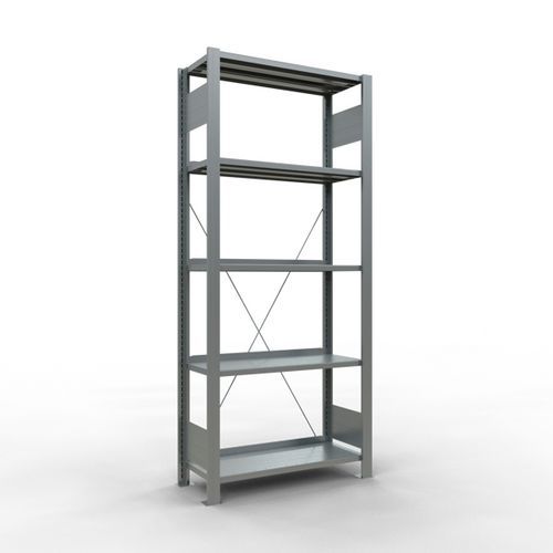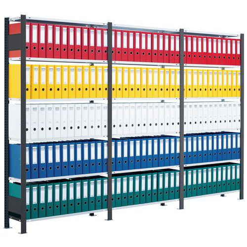 Mooi afgewerkte kantoorstelling voor lichte lasten. Legbord van plaatstaal voor allerlei soorten voorwerpen. Staander van dicht plaatstaal zonder perforatie aan de voorkant. Aanslagstang om te voorkomen dat voorwerpen kunnen vallen. Beschermende voet om de vloer te beschermen. Te monteren zonder gereedschap, met clipsysteem.