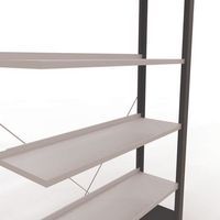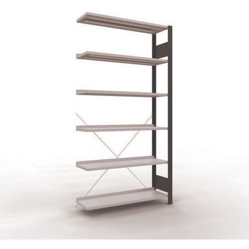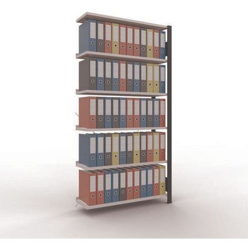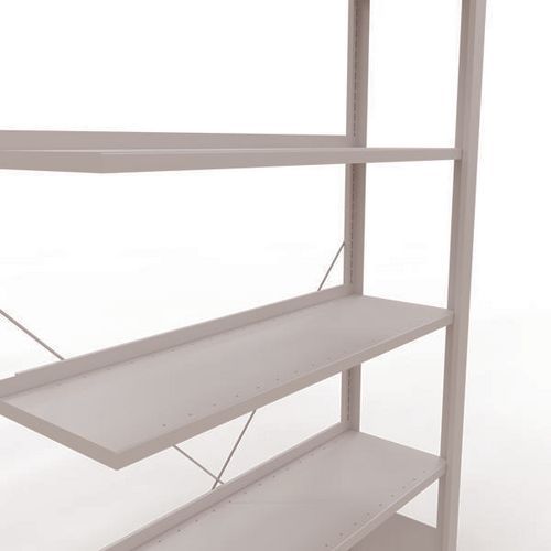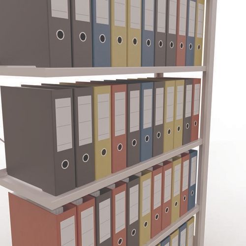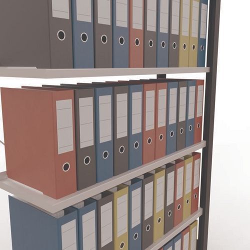 Mooi afgewerkte kantoorstelling voor lichte lasten. Legbord van plaatstaal voor allerlei soorten voorwerpen. Staander van dicht plaatstaal zonder perforatie aan de voorkant. Aanslagstang om te voorkomen dat voorwerpen kunnen vallen. Beschermende voet om de vloer te beschermen. Te monteren zonder gereedschap, met clipsysteem.