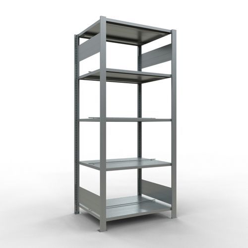Mooi afgewerkte kantoorstelling voor lichte lasten. Legbord van plaatstaal voor allerlei soorten voorwerpen. Middenstop voor de afbakening van iedere zijde. Staander van dicht plaatstaal zonder perforatie aan de voorkant. Beschermende voet om de vloer te beschermen. Te monteren zonder gereedschap, met clipsysteem.