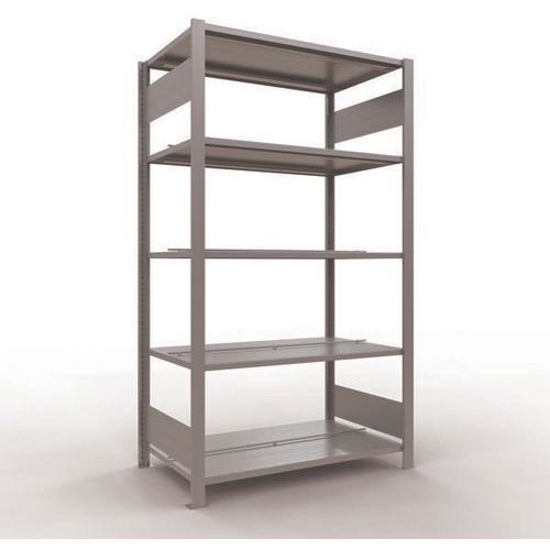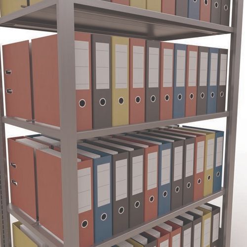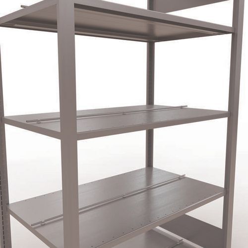 Mooi afgewerkte kantoorstelling voor lichte lasten. Legbord van plaatstaal voor allerlei soorten voorwerpen. Middenstop voor de afbakening van iedere zijde. Staander van dicht plaatstaal zonder perforatie aan de voorkant. Beschermende voet om de vloer te beschermen. Te monteren zonder gereedschap, met clipsysteem.