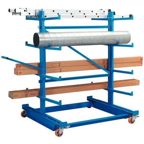 Stelling met draagarmen aan 2 kanten (2× 600 mm of 2× 800 mm) voor eenvoudige toegang tot de voorwerpen. Vaste aanslag op draagarmen: houdt de opgeslagen voorwerpen goed op hun plaats en voorkomt dat ze vallen. Eenvoudige assemblage en montage van de stelling. Cantilever zeer eenvoudig te verplaatsen dankzij de wielen.