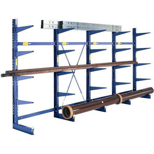 Enkelzijdige en dubbelzijdige draagarmstelling voor de verticale opslag van lange goederen. Arm zonder aanslag voor eenvoudige toegang tot de goederen op de stelling. Eenvoudig te monteren en onbeperkt uit te breiden met één of meer aanbouwstelling(en).