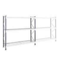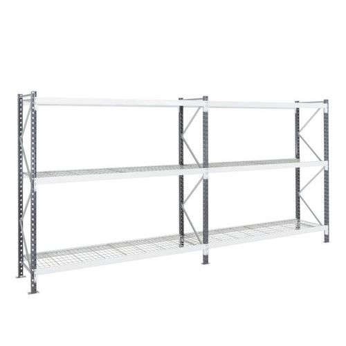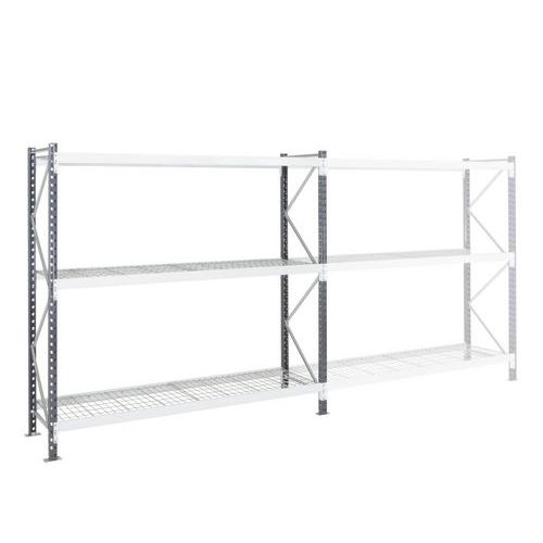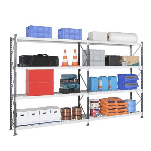 Stevige stalen magazijnstelling met zeer grote vakken. Gaaslegbord voor een goede ventilatie van de voorraad. Ligger met sponning en inkepingen voor haak van de dwarsliggers. Staanders met treden flesprofiel met geperforeerde buitenzijde. Eenvoudige aanbouwstelling, zeer eenvoudig te monteren. Gaaslegbord, ideaal voor zone met sprinklers.