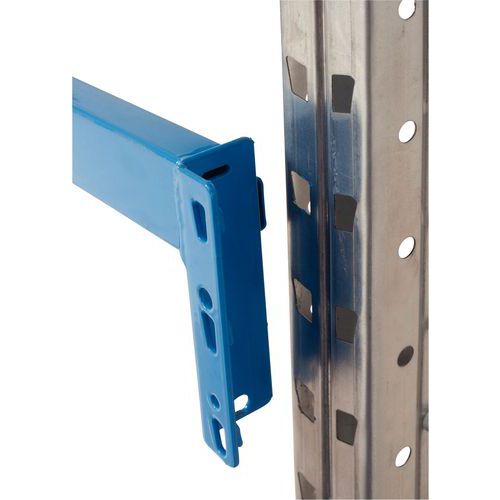 Stevige stalen magazijnstelling met zeer grote vakken. Vele beschikbare profielen voor verschillende toepassingen. Ligger met sponning en inkepingen voor haak van de dwarsliggers. Ligger, 2 versies waarvan 1 met perforaties voor tussenschotten. Staander met treden flesprofiel, geperforeerde buitenzijde. Gemakkelijke aanbouwstelling, eenvoudig te monteren. Legbord van spaanplaat, stevig en duurzaam. Ideaal voor de opslag van zware losse onderdelen!