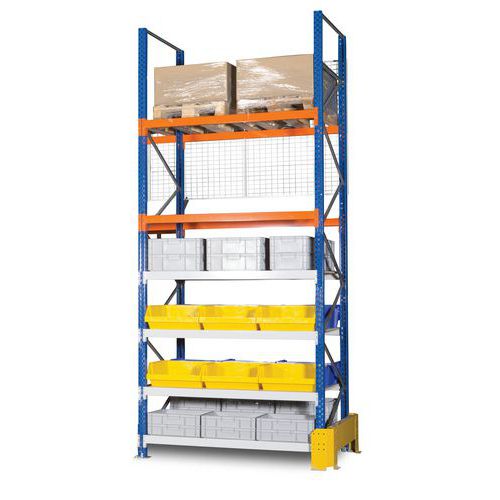 Combinatie van een breedvakstelling met legborden en een rek voor pallets. Hoge opslag van pallets op rechthoekige steunen: 1 of 2 niveau(s). Handmatige lage opslag op liggers met sponning en spaanplaat: 4 niveaus. Veiligheidsclip om de liggers te blokkeren: voorkomt het risico op losraken. Robuuste gemengde stelling, verkrijgbaar in 2 uitvoeringen: zonder of met valbeveiligingsrooster.
