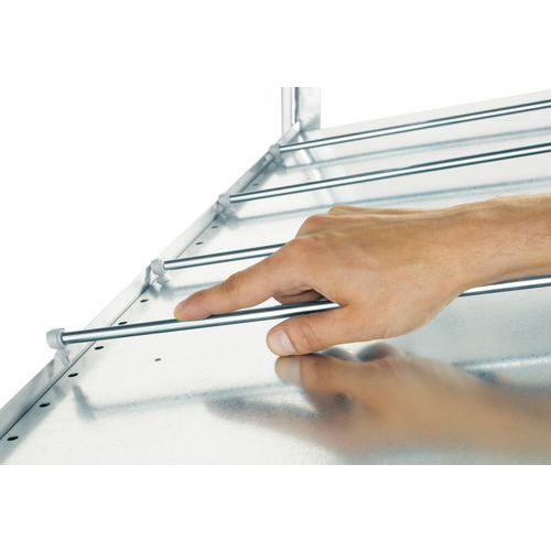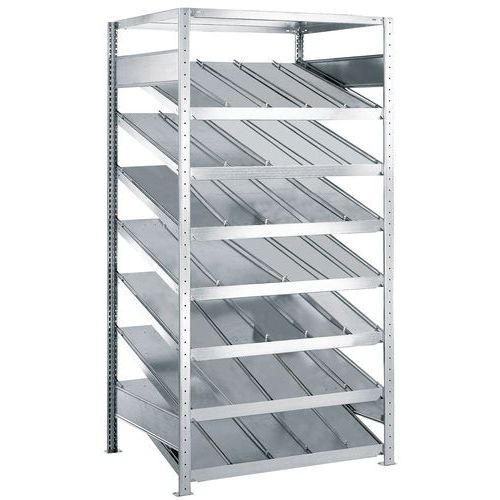 Dynamische stalen stelling met schuine legborden, geschikt voor FIFO-opslag (first in/first out). Optimale configuratie: schuin legbord uitgerust met 5 scheidingsgeleiders en 2 zijgeleiders. Legbord verstevigd met ligger, die aan de voorzijde verhoogd is met 15 mm om te voorkomen dat goederen vallen. Eenvoudige montage door het in elkaar schuiven van de legborden. Eenvoudig uit te breiden door toevoeging van aanbouwelementen. In hoogte verstelbaar in stappen van 25 mm. Verstelbare scheidingsgeleiders (in stappen van 50 mm).