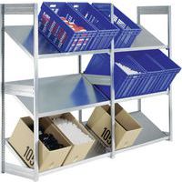 Lichte stelling van gegalvaniseerd staal met schuine legborden en een stopper aan de voorkant. Uitstekende zichtbaarheid van de opgeslagen goederen.