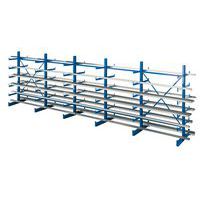 Enkelzijdige en dubbelzijdige draagarmstelling voor de horizontale opslag. Bescherming tegen rollen om te voorkomen dat materialen eraf vallen. Uitbreidbaar met 1 of meer aanbouwstellingen. Draagarmstelling met snelle montage dankzij de gelaste armen. Staanders met 5 of 10 vaste armen met stopper. Ruimte tussen 2 staanders: 1200 mm. Ruimte tussen 2 armen: 1225 mm.