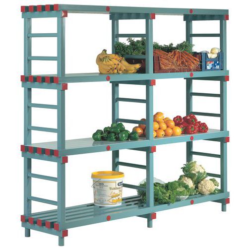 Hoekstelling 4 niveaus, diepte 40 cm. Geperforeerde rekken van polypropyleen met hoge dichtheid, met versteklegbord voor markering. Ladder van geanodiseerd aluminium met stelpoten zonder zichtbare schroefdraad. Legplank bestaande uit 2 liggers van geanodiseerd aluminium en een combinatie van rekken. Maximale belasting 200 kg, gelijkmatig verdeeld per niveau.