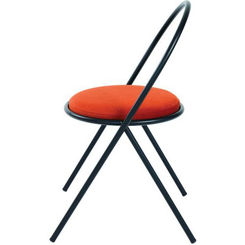 Stoel met platte rol van velours Saturne. Constructie: stalen buis met epoxyafwerking Ø 30 mm. Zitting van spaanplaat, dikte 15 mm. Velours, 100% polyester, niet-verwijderbaar. Bekleding van polyurethaanschuim 30 kg/m³, dikte 30 mm.