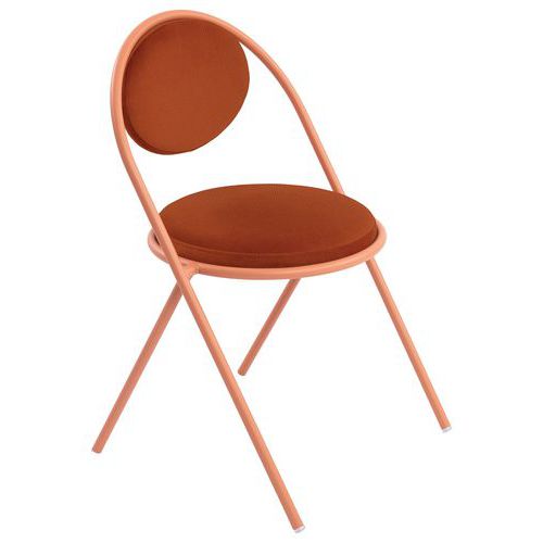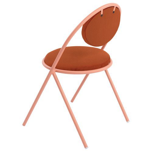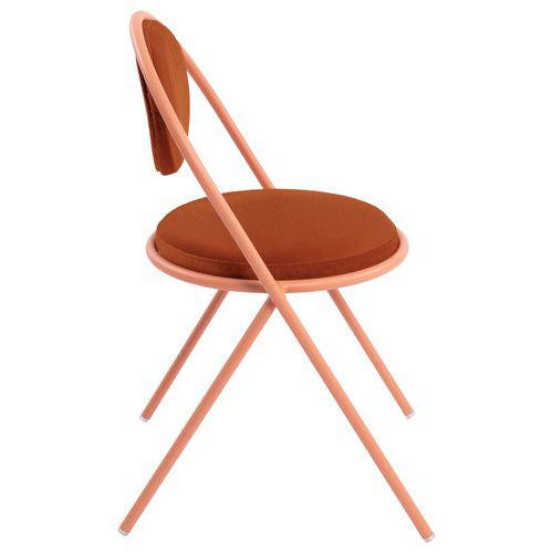 Modern ontwerp Langere levensduur: de zitting en rugleuning kunnen vervangen worden, de stof is niet verwijderbaar Stapelbaar Frame: buis Ø20 mm van 100% gerecycled staal met een epoxy-afwerking Zitting: multiplex paneel, dikte 12 mm Voering: polyurethaanschuim 30 kg/m3, dikte 30 mm