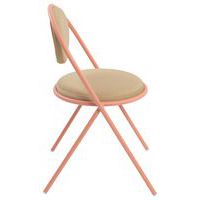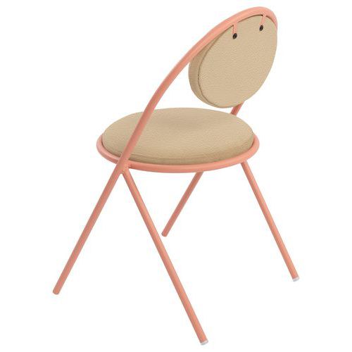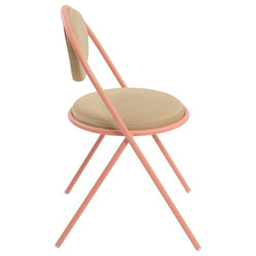 Modern ontwerp Langere levensduur: de zitting en rugleuning kunnen vervangen worden, de stof is niet verwijderbaar Stapelbaar Frame: buis Ø20 mm van 100% gerecycled staal met een epoxy-afwerking Zitting: multiplex paneel, dikte 12 mm Voering: polyurethaanschuim 30 kg/m3, dikte 30 mm