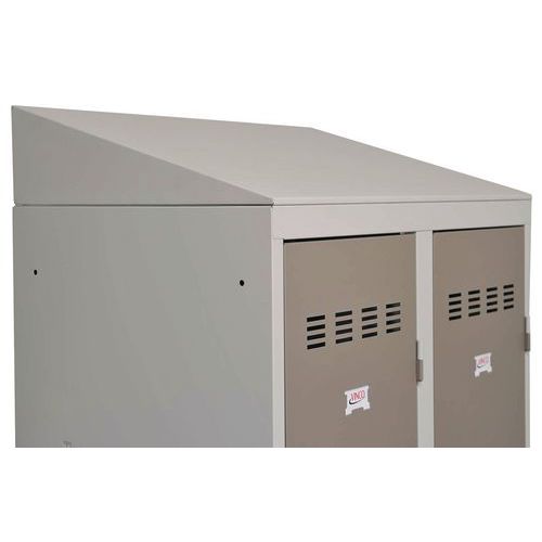 De stofkap zorgt voor perfecte hygiëne en onderhoud van de garderobekast. Eenvoudige en veilige montage door bevestiging met klinknagels met nylon knoppen. Zeer bestendige stalen kap voor garderobekast uit één stuk. Hellingshoek 16°.