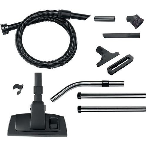 Geleverd met set accessoires diam. 32 mm: 1 slang (2,5 m), 1 gebogen slang met zuigkrachtregeling, 1 slang (2,2 m), 2 rvs buizen, 1 gecombineerde stofsensor voor vloeren en tapijt, 1 tapijtstofsensor (vervangt meubelborstels), 1 platte zuigmond (vervangt het opzetstuk voor plinten).