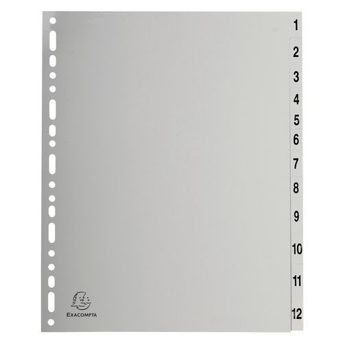 | Productnaam | Tabblad bedrukte tabs grijs pp 12 tabs 1 tot 12 A4 Exacompta, Aantal tabs: 12, Kleur: Grijs |