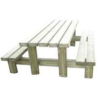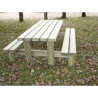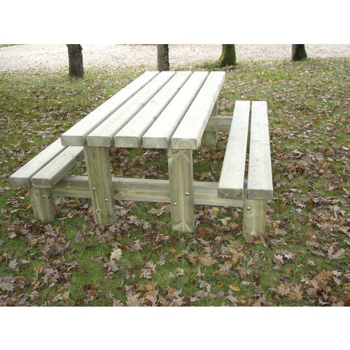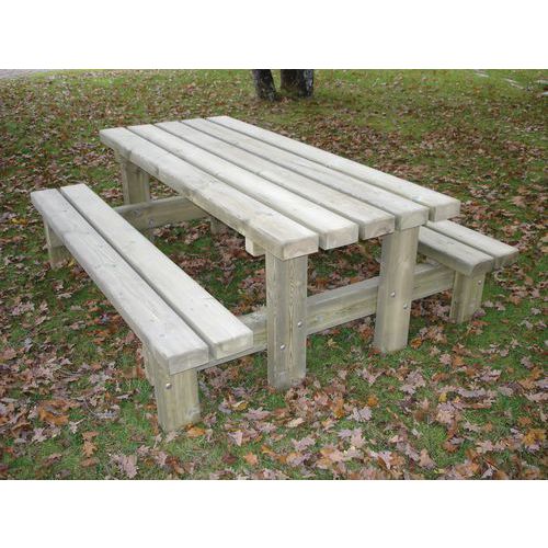 Geïmpregneerd onder druk, klasse IV. Wateroplossing, zonder chroom of arsenicum. Picknicktafel rustiek. Planken van 14,5 x 6,8 cm. Voeten en verstevigingen van 14,5 x 6,8 cm