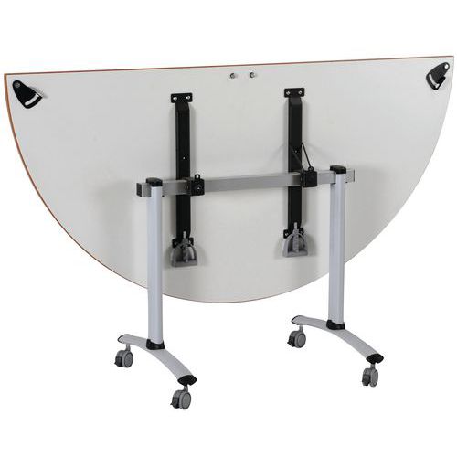 Halfronde klapvergadertafel Axe, met draaiplateau voor optimale ruimtebesparing bij het opbergen. Automatische vergrendeling van de plaat in de werkstand (horizontaal) en verticale positie (opslag). Systeem voor snelle verbinding tussen de bladen met draaischroef. Voorzien van 4 wielen van Ø 75, met rem. Halfronde klapvergadertafel Axe met draaiplateau voor optimale ruimtebesparing bij het opbergen. Automatische vergrendeling van de plaat in de werkstand (horizontaal) en verticale positie (opslag). Systeem voor snelle verbinding tussen de bladen met draaischroef. Uitgerust met 4 wielen van Ø 75 mm, met rem. Randen van ABS, dikte 2 mm. Metalen onderstel met epoxylak. Geproduceerd in Frankrijk. Geleverd met ongemonteerde poten.