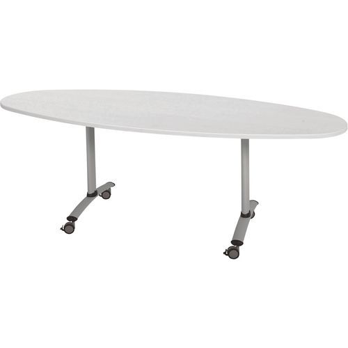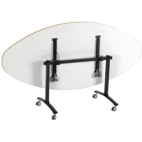 Ovale klapvergadertafel Axe met draaiplateau voor optimale ruimtebesparing bij het opbergen. Automatische vergrendeling van de plaat in de werkstand (horizontaal) en verticale positie (opslag). Systeem voor snelle verbinding tussen de bladen met draaischroef. Voorzien van 4 wielen van Ø 75, met rem. Ovale klapvergadertafel Axe met draaiplateau voor optimale ruimtebesparing bij het opbergen. Automatische vergrendeling van de plaat in de werkstand (horizontaal) en verticale positie (opslag). Systeem voor snelle verbinding tussen de bladen met draaischroef. Uitgerust met 4 wielen van Ø 75 mm, met rem.