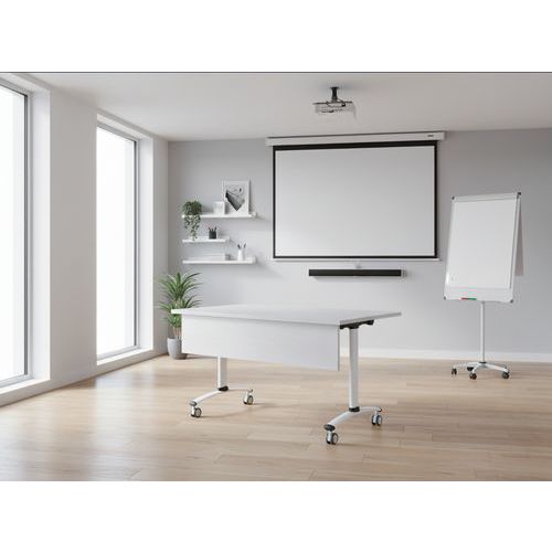 Rechthoekige inklapbare vergadertafel met bescheiden paneel Axe met draaiblad voor ruimtebesparende opslag. Het laminaatblad is geschikt voor maaltijden en kan worden gereinigd met zeepwater. Automatische vergrendeling van het blad in werkpositie (horizontaal) en verticale positie (opslag). Snelkoppelingssysteem tussen de bladen met een duimschroef. Uitgerust met 4 wielen Ø 75 mm met rem. Frontpaneel hoogte 25 cm. Randen van ABS, dikte 2 mm. Metalen onderstel met epoxylak. Geproduceerd in Frankrijk. Geleverd met ongemonteerde poten.