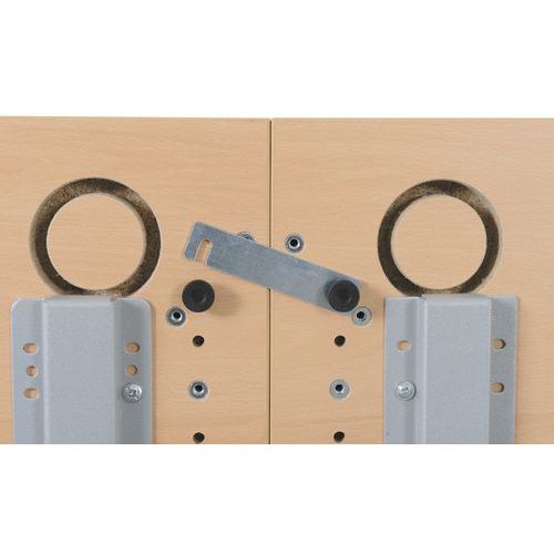 Spaanplaat met een dichtheid van 70 kg/m3, dikte 25 mm. Zeer bestendige melamine Centrale balk onder bureaublad, doorsnede 40 mm Onderstel op in meerdere richtingen draaibare wielen met rem Randen van ABS dikte 2 mm, in dezelfde kleur als het bureaublad Frame en onderstel van koud gelamineerd staal, dikte 2 mm, met epoxylak in de kleur aluminium Wielen Ø 60 mm met rem Monteerklaar geleverd met handleiding.