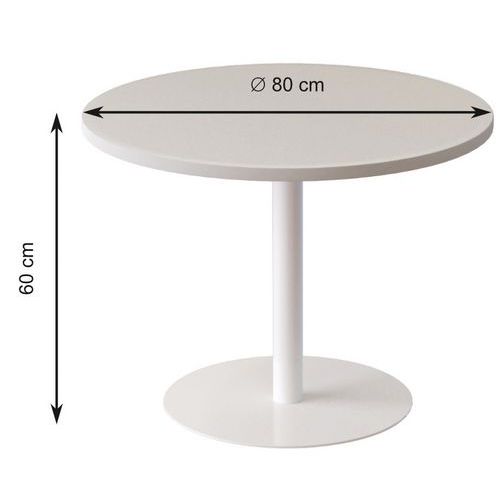 25 mm dik melamine blad met 2 mm ABS rand Diameter bak 80 cm Wit epoxy gelakt stalen onderstel. Centraal onderstel op krasvast wit epoxygelakt stalen onderstel. Voet Ø 49,5 cm, dikte 4 mm. Geleverd klaar om te passen met instructies.