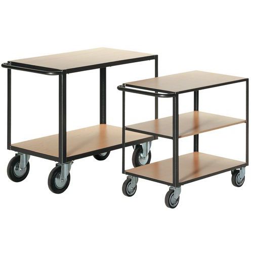 - Trolley met houten plateaus met buisframe van staal. Houten MDF plateaus, geschikt voor zware lasten.