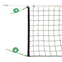 - Volleybalnet van 2,3 mm dik polypropyleen, knooploze mazen van 100 mm, voorzien van een staalkabel met een diameter van 3 mm, lengte van 10,30 m en karabijnhaken (korte kabel).