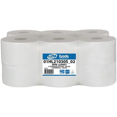 | Productnaam | Toiletpapier Mini Jumbo, Aantal vouwen: 2, Lengte rol: 210 m, Kleur: Wit, Gramsgewicht: 14.5 g/m² |