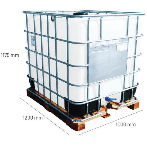 | Productnaam | Transportbak 1000 l gerenoveerd en goedgekeurd + pallet, Totale inhoud: 1000 L, Totale hoogte: 1175 mm |