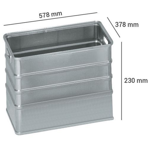 | Productnaam | Transportbak aluminium, Totale inhoud: 36 L, Totale hoogte: 230 mm, Totale breedte: 378 mm |