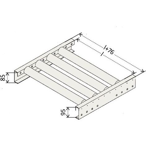 Transportband met pvc rollen TRS met frame van staal 20/10e. Bekleding van epoxylak. Laadvermogen tot 80 kg/m. Rol pvc met een diameter van 50 mm met kogellager. Eenvoudig onderhoud van rollen met as met veer, geen vet. Werkt op basis van zwaartekracht met een helling van 5 tot 6% via verstelling van de steunvoeten.