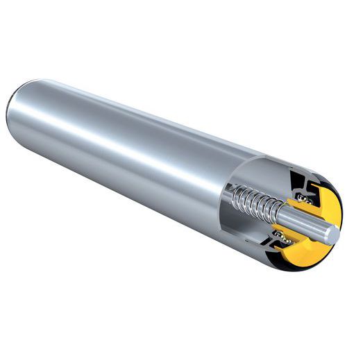 Transportband TRS met stalen rollen en metalen frame in 'C’, staal 20/10e. Kan als module worden gebruikt met een gebogen element waarvan het frame dezelfde breedte heeft. Rollenbaan met stevig frame, bedekt met epoxylak RAL 5017. Uitgerust met rollen van gegalvaniseerd staal Ø 50 mm op kogelrollagers, geen onderhoud nodig. Rollen met verende assen voor een eenvoudige vervanging.