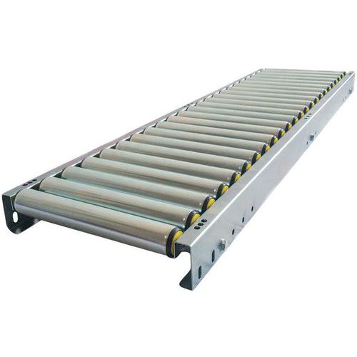 Transportband TRS met stalen rollen en metalen frame in 'C’, staal 20/10e. Kan als module worden gebruikt met een gebogen element waarvan het frame dezelfde breedte heeft. Rollenbaan met stevig frame, bedekt met epoxylak RAL 5017. Uitgerust met rollen van gegalvaniseerd staal Ø 50 mm op kogelrollagers, geen onderhoud nodig. Rollen met verende assen voor een eenvoudige vervanging. Klantgarantie : 3 jaar