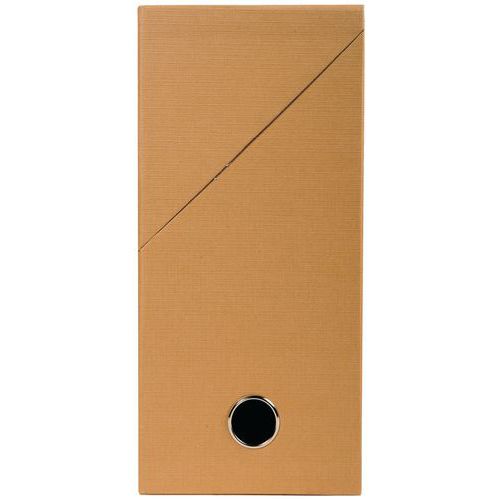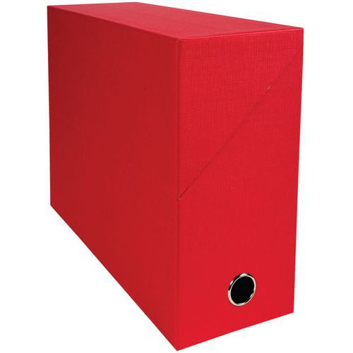 Transportdoos Rug 120mm Deze stevige transportbox, gemaakt uit hard karton overtrokken met gestruktureerd gekleurd papier,is erg praktisch voor het archiveren van omvangrijke dossiers. Versterkte klep om de box zorgvuldig gesloten te houden. Metalen grijpring voor een betere grip. Gemonteerd geleverd