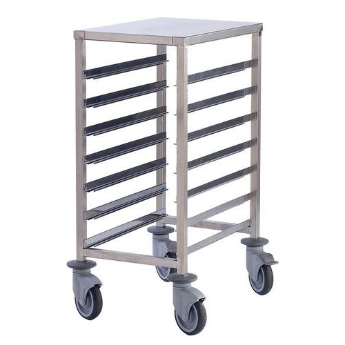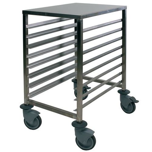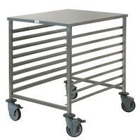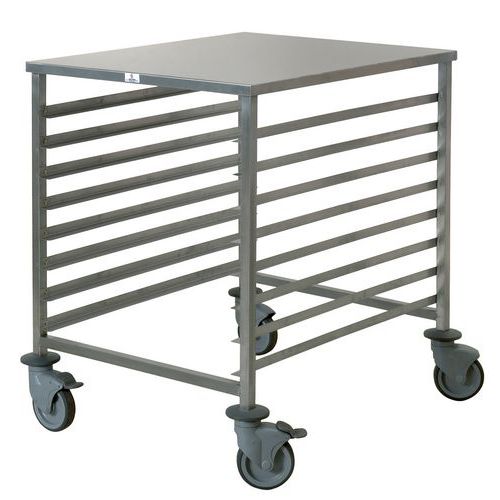 Transportwagen waarvan het geluiddichte bovenpaneel van rvs dienst kan doen als mobiel werkblad of als steun voor een machine.