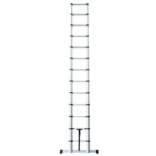 Telescopische ladder van aluminium, uiterst compact. Beveiligde constructie met vergrendelingsindicator. Systeem om de sluiting te vertragen. Comfortabel met treden met antislipstrepen XL. Eenvoudig toegankelijk: ruimte van 26 cm tussen de treden. Eenvoudig op te bergen en te vervoeren met een transporthandgreep.