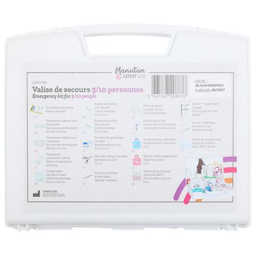 | Productnaam | Uitgebreide universele EHBO-koffer voor 5 tot 10 personen, Kleur: Wit, Breedte: 205 mm, Lengtes: 240 mm |