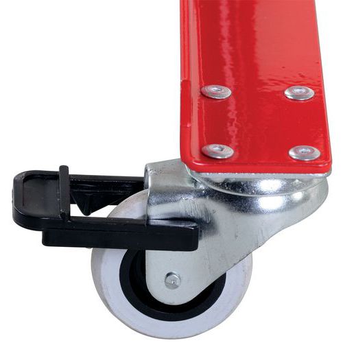 Met poedercoating. Met zelfblokkerende moeren in het uitschuifbare gedeelte. Met reflecterende waarschuwingsmarkering aan weerszijden. Zeer gebruiksvriendelijk. Met rem op zwenkwiel.
