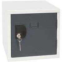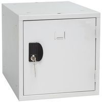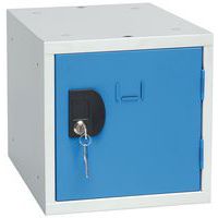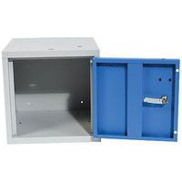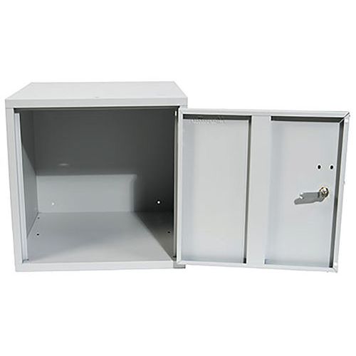 Voorgeboorde kubuskast, zelf te monteren. Afsluitbaar met cilinderslot. Vak met ruimte voor etikethouders. Comfortabel met deur die tot 180° te openen is.