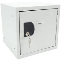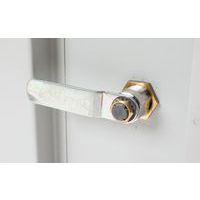 Voorgeboorde kubuskast, zelf te monteren. Afsluitbaar met cilinderslot. Vak met ruimte voor etikethouders. Comfortabel met deur die tot 180° te openen is.