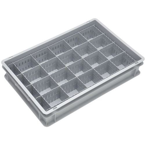 Vakverdeler voor Euronorm bak bak van 400x300 mm en 600x400 mm van geleidingsmateriaal. De tussenschotten kunnen op elkaar worden gestapeld in de bakken.