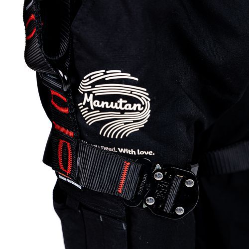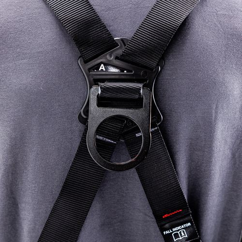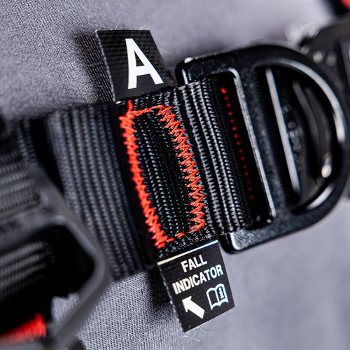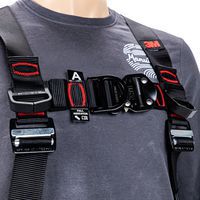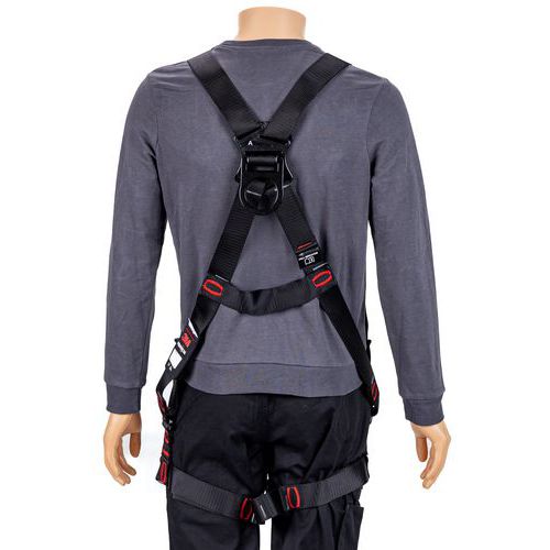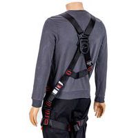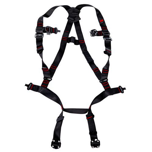 Standaard valbeveiligingsharnas met horizontale dijriemen en 2 aanhaakpunten. Met valindicator aan voor- en achterkant. 2 automatisch opnieuw instellende lijnhoudergespen voor valkoorden. Uiteinden van de singelbanden met klittenband. Afgeschermde labels die langdurig leesbaar blijven voor eenvoudige en eenvoudige inspectie. Scharnierende aanhaakpunten.