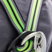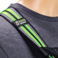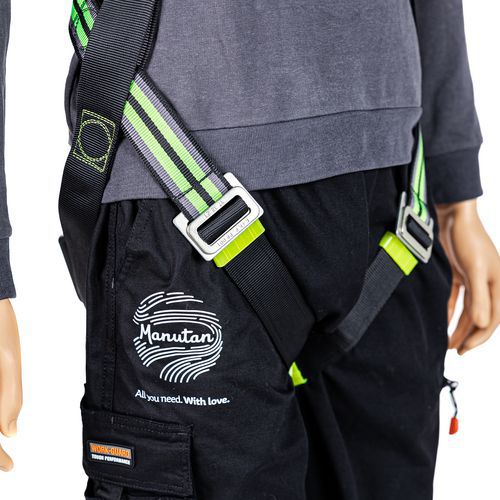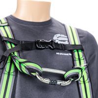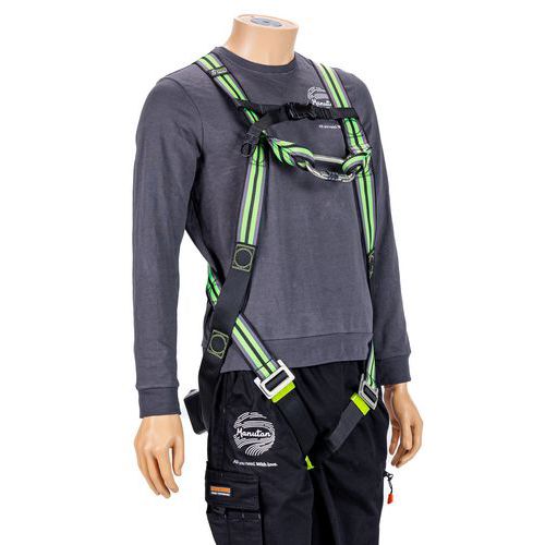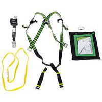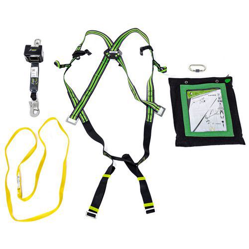 Set bestaande uit 1 harnas, 1 musketon van staal met schroefvergrendeling, 1 verankeringsring lengte 1,20 m, 1 valbeveiliging met automatische terugstelling in band lengte 2,5 m, 1 transporttas.