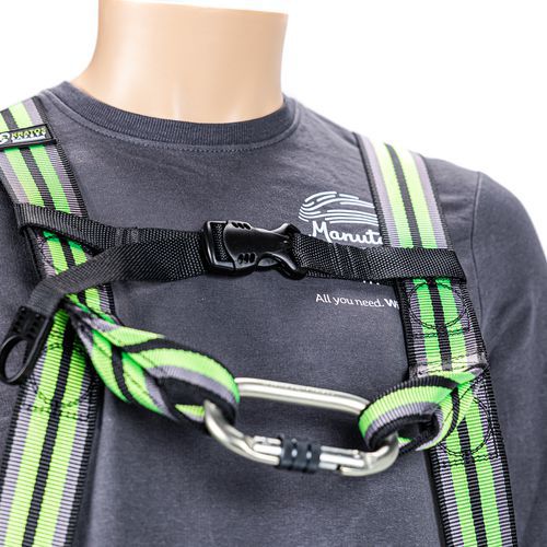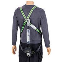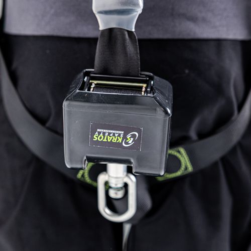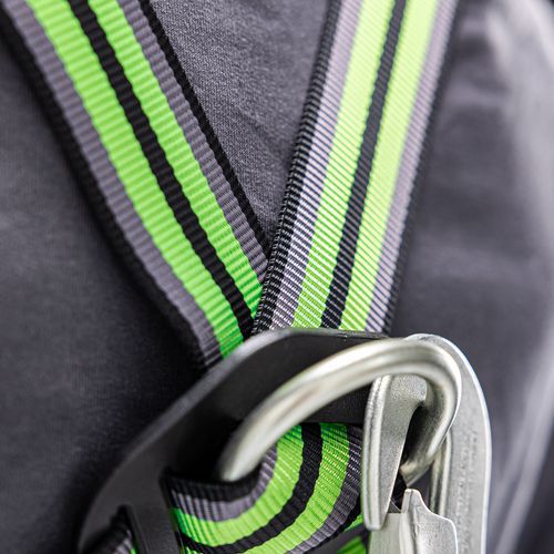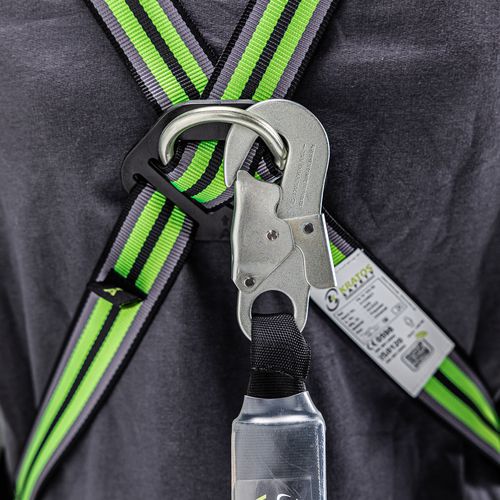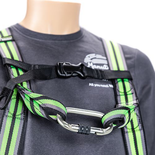 Set speciaal ontworpen voor industrieel onderhoud met harnas, musketon, verankeringsring en valbeveiliging met automatische terugstelling in band.