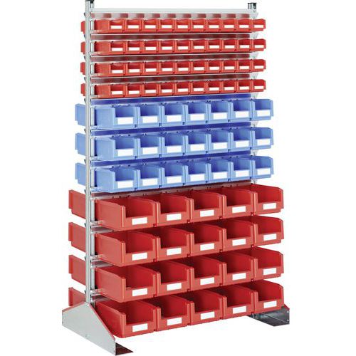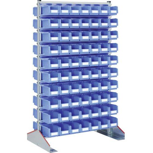 Vast dubbelzijdig rek met stapelbakken voor het opbergen van diverse voorwerpen.